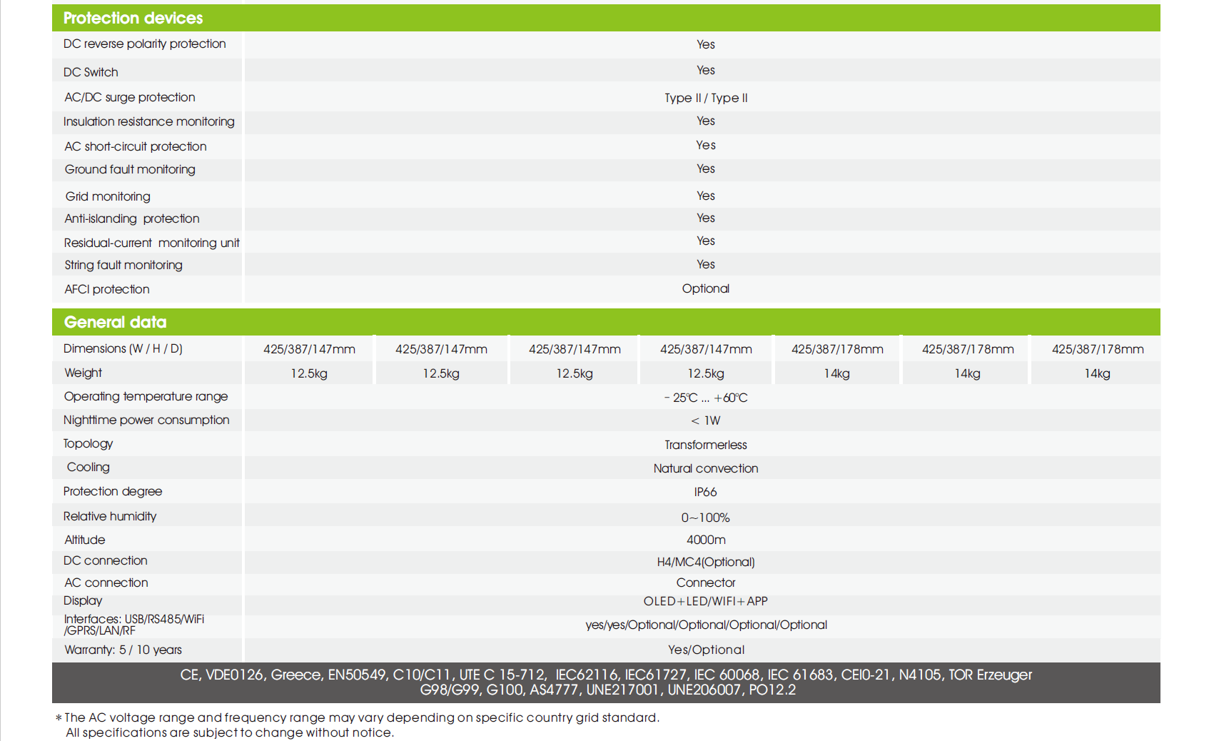 Certificate: CE, VDE0126, Greece, EN50549, C10/C11, UTE C 15-712, IEC62116, IEC61727, IEC 60068, IEC 61683, CEI0-21, N4105, TOR Erzeuger, G98/G99, G100, AS4777, UNE217001, UNE206007, PO12.2