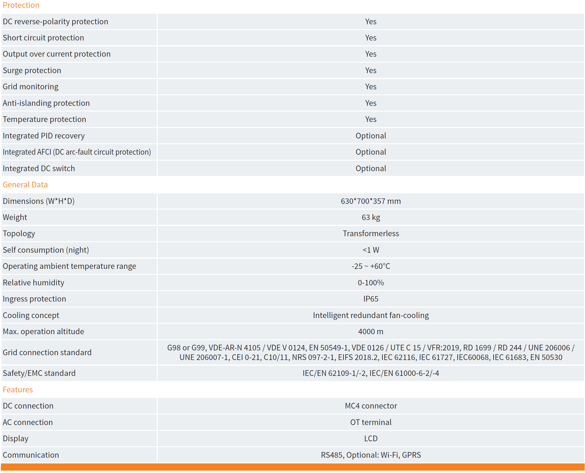 Grid connection standard : G98 or G99, VDE-AR-N 4105 / VDE V 0124, EN 50549-1, VDE 0126 / UTE C 15 / VFR:2019, RD 1699 / RD 244 / UNE 206006 /