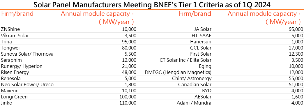 As of the first quarter of 2024, the list of solar panel manufacturers meeting BNEF's Tier 1 criteria has been released.Surprisingly, compared to the previous round, over 40% of PV module manufacturers have temporarily withdrawn. The reason for this is that BNEF has revised the rules, significantly raising the entry threshold. The new regulations require PV panel manufacturers to submit detailed financing information for 6 photovoltaic projects, each with a capacity of 5MW, whereas the previous requirement was for manufacturers to provide financing details for 6 photovoltaic projects, each with a capacity of 1.5MW.